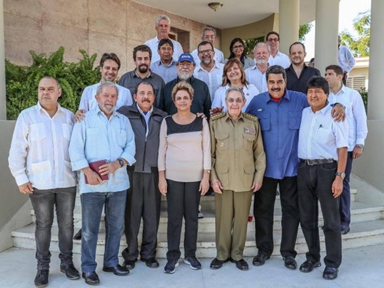 Mas o PT não fez nada disso e, ao que tudo indica, jamais o fará. Pelo contrário, Lula solto reafirmou o hegemonismo petista, declarou que o partido não deve fazer qualquer autocrítica (como se nada tivesse feito de errado, como se o mensalão e o petrolão não passassem de acusações falsas de seus inimigos) e ainda prometeu mais polarização. Em síntese, mostrando que não evoluiu um milímetro, Lula fez o PT voltar ao lugar do passado onde sua triste trajetória foi interrompida, para proclamar que continuará trilhando o caminho do neopopulismo (o populismo de esquerda que abraçou juntamente com seus parceiros bolivarianos, castristas, chavistas, lugoistas, evoistas, correistas, orteguistas ou sandinistas de segunda geração, funesistas et coetera). Basta olhar a foto que ilustra este post. Ou então a foto abaixo, onde aparecem Lula e Dilma, agitando bandeirinhas de Cuba, ao lado dos ditadores Raul Castro e Nicolás Maduro: