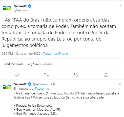Em um tweet conjunto de ontem a noite, Jair Bolsonaro, Hamilton Mourão e Fernando Azevedo, atacaram frontalmente a democracia.