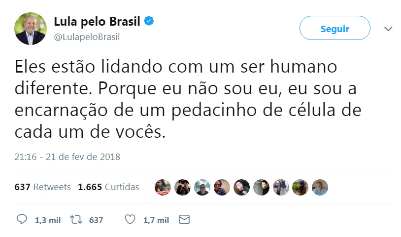 Causou alvoroço no Twitter a frase de Lula, publicada em 21 de fevereiro de 2018, quando o líder ainda estava solto.