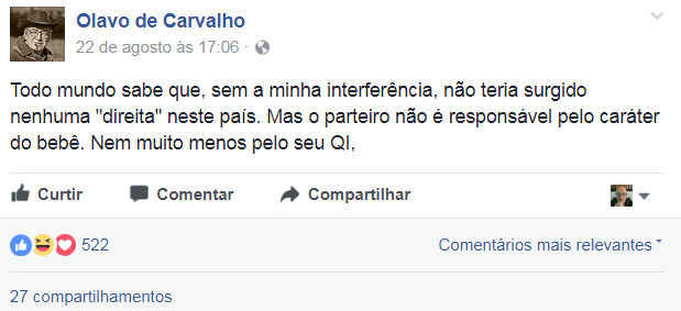 Vejamos. Sem ele, Olavo, não haveria a direita brasileira. Seus alunos (e mais ninguém) são a única esperança. Adultos não devem brincar com crianças (mas montar guarda sobre elas). Mulheres devem subordinar seus desejos pessoais aos dos maridos que as sustentam. A natureza (ele quer se referir à espécies de um reino de seres vivos: animalia) é machista.