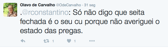 Os petistas eram mais educados nos xingamentos. Os olavistas seguem em tudo seu mestre, principalmente na baixaria. Como colegiais de reformatório, atacam os que criticam suas ideias deformando-lhes o patronímico: o Reinaldo Azevedo chamam de “Arruinaldo Azevedo”, o Marco Antonio Villa de “Marco Antonio Vil”, o Rodrigo Constantino de “Rodrigo Cocô”. A mim o sumo sacerdote resolveu chamar de “Augusto de Frango”. Não deixa de ter sua graça. O mais curioso é que falam sem parar de cu e bunda. Pois não é que o filósofo de baixo calão declarou hoje, em comentário no meu mural (reproduzido acima): “estou velho demais para poder satisfazer o seu bumbum guloso”. Em seguida um de seus discípulos acrescentou (confiram também na transcrição acima) que eu “espero uma piroca na boca e um cano no cu”. A sordidez dos sequazes seguiu então a mesma toada. E não é porque o meu post fazia referência à compensação psicológica para a perda de potência pela fixação em armas (e não falei em pinto de ninguém: isso foi inventado pelo Olavo). Não! Vejam como ele tratou o Rodrigo Constantino (que disse – com razão – que os seguidores de Olavo mais pareciam uma seita):
