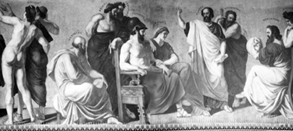 En uno de ellos se representan varias personalidades célebres de la historia del pensamiento griego, tal y como el pintor se figura una reunión entre ellas. En la imaginaria convención de pensadores se encuentran, por ejemplo, Sócrates, Fidias y Sófocles a espaldas de Pericles, y frente a este último Platón, Antístenes, Anaxágoras y Alcibíades. Adicional a tan grandes nombres vemos una figura que toma dulcemente el brazo de Pericles con una mano, aunque posa su otro brazo sobre el hombro del gran general, en lo que podría interpretarse como un gesto de camaradería. La expresión de su cara es de absoluto interés en la conversación que se está presentando, que puede razonablemente suponerse animada por un discurso naturalista de parte de Anaxágoras. La posición de esta figura femenina en el fresco no es en ningún sentido menos importante que la de los pensadores allí congregados: Aspasia asiste a la reunión como una igual (2). Es evidente que tal congregación de celebridades presenta más de un anacronismo, pues Platón, por ejemplo, nació después de la muerte de Pericles (WAITHE 1987: 75). Pero estos pequeños detalles no le restan importancia ni belleza a la obra; la elección deliberada de nombres, sin embargo, resulta elocuente acerca de un capítulo de la tradición doxográfica griega que me interesa discutir.