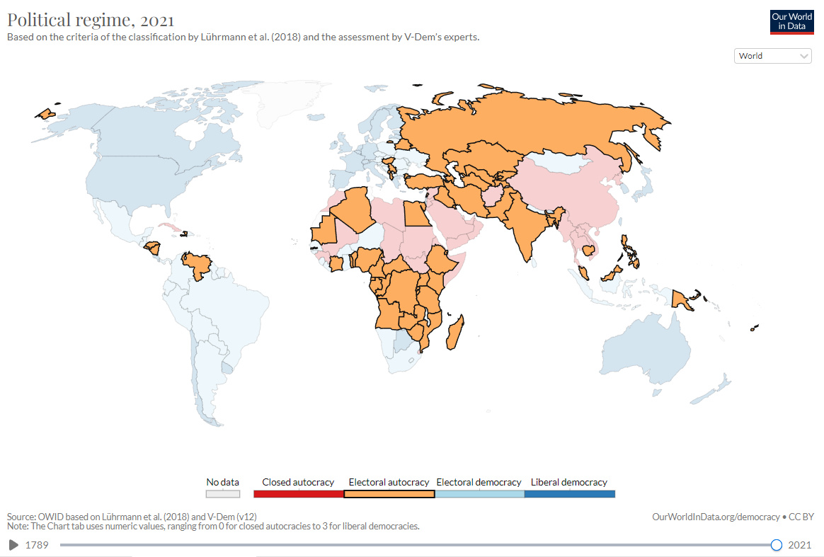 Claro que, em maior número, temos as democracias eleitorais (2), em maior número ainda as autocracias eleitorais (3) e em menor número as autocracias fechadas (4).