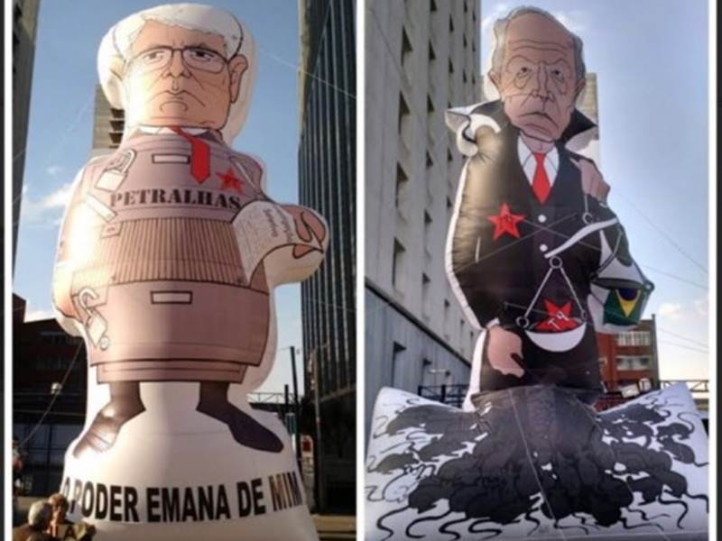 Publicamos ontem, na seção de textos teóricos de Dagobah, um artigo intitulado Estado de direito é sinônimo de Estado democrático? E hoje ficamos sabendo que o Supremo Tribunal Federal enviou à Polícia Federal um pedido de investigação sobre os bonecos Petralowski e Enganô (ver imagem). Tudo partiu do parecer de um tal Murilo Herz, secretário de Segurança do Supremo (quem sabia que um troço desse existia?), que viu nas representações uma “grave ameaça à ordem pública e inaceitável atentado à credibilidade” do Judiciário, que ultrapassariam os limites da liberdade de expressão.