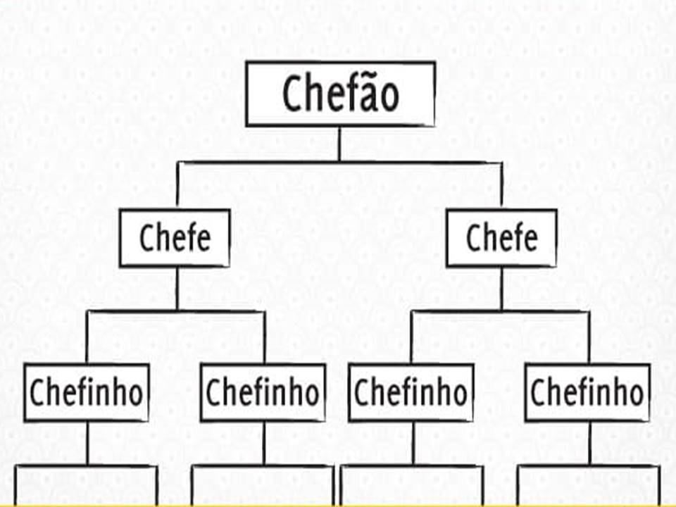 No diagrama (B) da figura acima temos o padrão descentralizado que não representa uma topologia sem centro, mas, pelo contrário, uma configuração multicentralizada. Esse padrão nada mais é do que uma hierarquia (correspondendo a um organograma de qualquer entidade hierárquica, como a que segue na próxima figura).