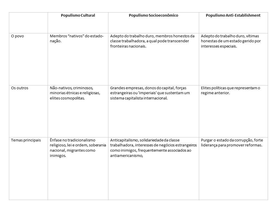 É preciso entender os populismos contemporâneos. Uma característica definidora de qualquer populismo é praticar a política como questão de lado: o lado do povo (“the true people“) x o lado dos outros (das elites, do establishment etc.). A tabela abaixo, preparada por Jordan Kyle e Limor Gultchin (2018), para o artigo Populistas no poder ao redor do mundo e publicado pelo Tony Blair Institute for Global Change, descreve as três maneiras pelas quais os populistas enquadram o conflito “nós vs eles”: