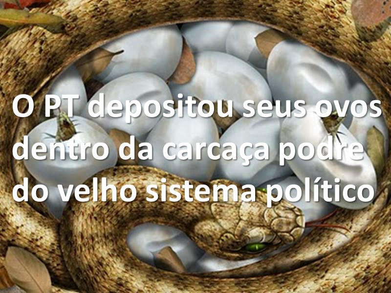Qual é o enigma? O enigma é a corrupção do PT. Ele pode ser sintetizado na imagem que ilustra este post. Sim, o PT depositou seus ovos dentro da carcaça podre do velho sistema político. Adotou uma artimanha, bem elaborada e extremamente eficaz, que foi a de esconder a sua corrupção sistêmica, centralizada e coordenada partidariamente com o objetivo de financiar um projeto de poder, dentro da corrupção tradicional dos atores, endêmica na política em todos as épocas e lugares (a qual também praticou, por fraqueza da carne, mas até como despiste ou disfarce). Esse tipo de coprofagia política foi um golpe de mestre. Honra ao mérito: o falecido Consigliere Thomaz Bastos foi um dos autores da narrativa, logo adotada por Lula numa entrevista em Paris no auge do mensalão: “O PT errou ao fazer o que todos os partidos fazem”. Pronto! Estava lançada a pedra fundamental da construção de um pensamento ilusionista que confundia a compra de parlamentares para falsificar a vontade das urnas com caixa 2 de campanha eleitoral. O truque deu certo. E deu tão certo que, mesmo depois das revelações estarrecedoras do petrolão, a explicação continuou fazendo sentido. O PT é corrupto, mas quem não é? E aí uma máquina de mistificação começou a trabalhar a todo vapor para produzir evidências de que todos os partidos são corruptos. Colou!