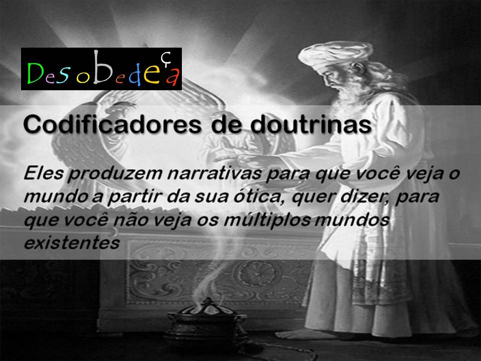 DESOBEDEÇA aos codificadores de doutrinas, que são todos aqueles que querem pavimentar, com as suas crenças religiosas (e sempre o são, mesmo quando se declaram laicas), uma estrada para o futuro. Eles produzem narrativas ideológicas totalizantes para que você veja o mundo a partir da sua ótica, quer dizer, para que você não veja os múltiplos mundos existentes, mas apenas um mundo (o mundo arquitetado e administrado por eles: uma prisão para a sua imaginação).