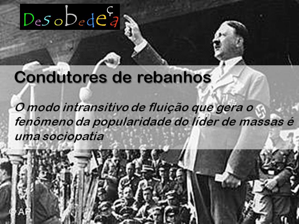 DESOBEDEÇA aos condutores de rebanhos, que são, em geral, os líderes que alcançaram popularidade pelo broadcasting para guiar as massas. Algumas vezes esses líderes são carismáticos e se dedicam a mesmerizar multidões em comícios, reuniões e manifestações. Ou pela TV e pelo rádio. Quase sempre são pessoas “pesadas”, que usam sua gravitatem em benefício próprio ou de um grupo, para reter em suas mãos o poder pelo maior tempo que for possível, transformando os outros em seus satélites. E odeiam os princípios de rotatividade ou alternância democrática. Considere que, do ponto de vista social (ou coletivo, da rede), o modo intransitivo de fluição que gera o fenômeno da popularidade do líder de massas é uma sociopatia.
