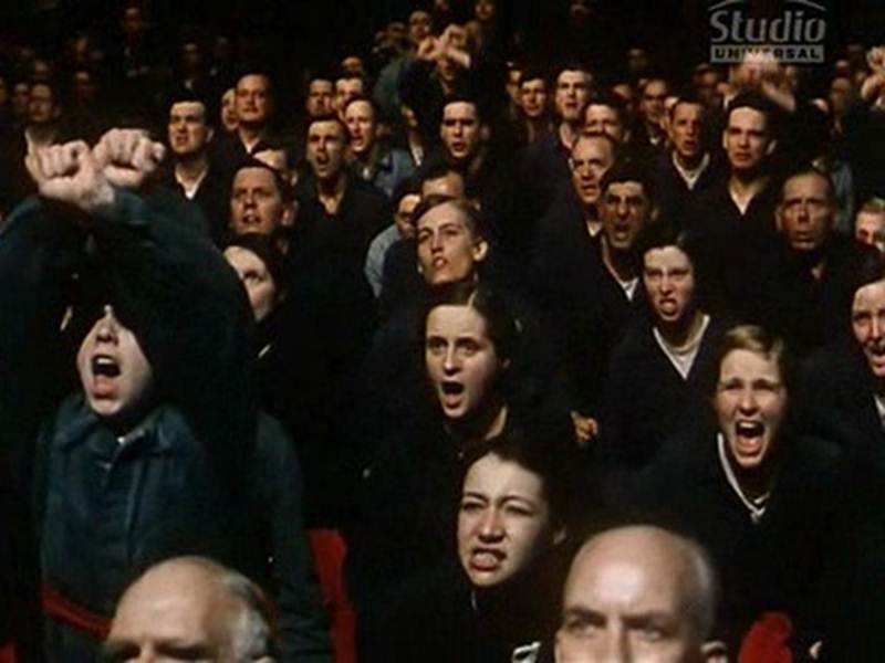 “Mais um instante, e um guincho horrendo, áspero, como de uma máquina monstruosa funcionando sem óleo, saiu da grande teletela. Era um barulho de fazer ranger os dentes e arrepiar os cabelos da nuca. O ódio começara.
