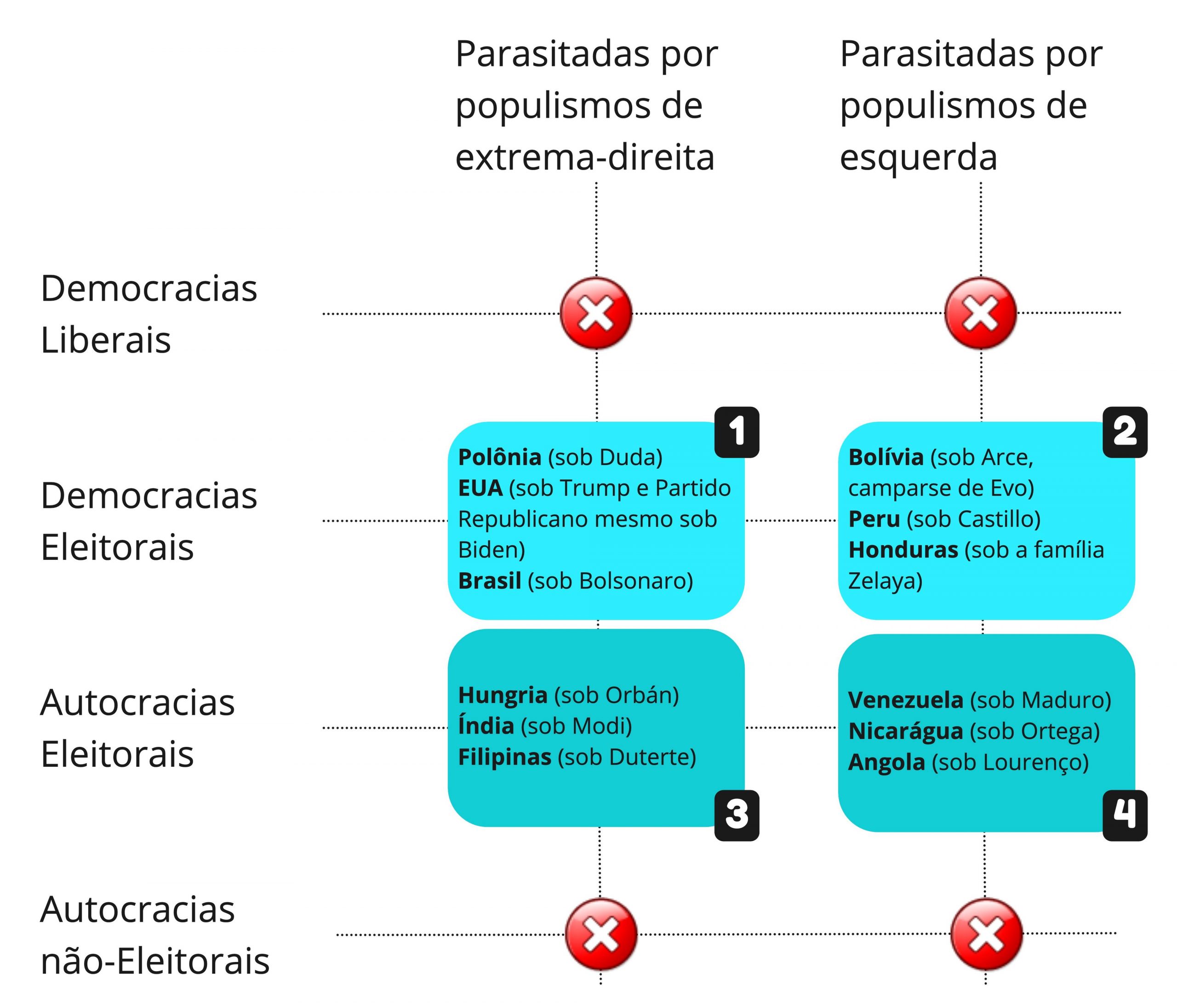 Para entender por quê os populismos contemporâneos são regimes de guerra eleitoral, cruzamos a classificação dos regimes políticos do V-Dem (da Universidade de Gotemburgo) com o estudo empírico dos populismos. Citamos apenas três exemplos de cada para ilustrar.