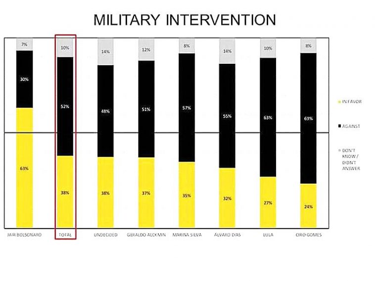 Os números não mentem. Do eleitorado do deputado Jair Bolsonaro, pré-candidato do PSL à Presidência da República, precisamente 63% defendem uma intervenção militar no governo. Logo atrás de Bolsonaro, com 38%, estão os brasileiros em geral. Não é pouca coisa, basta ver o número de indecisos que somam o mesmo percentual: 38%. Bem abaixo vêm os eleitores dos demais candidatos que também desejam manifestação de força para conquistar o Palácio do Planalto: Geraldo Alckmin (37%), Marina Silva (35%), Álvaro Dias (32%), Lula (27%) e Ciro Gomes (24%). Ou seja, o ponto fora da média é mesmo o candidato-capitão, como mostra a última pesquisa semanal da XP, feita pelo Instituto de Pesquisas Sociais, Políticas e Econômicas (Ipespe) que, pela primeira vez, introduziu grandes temas polêmicos, de interesse da sociedade e cruzou as respostas com os candidatos preferidos de cada eleitor.