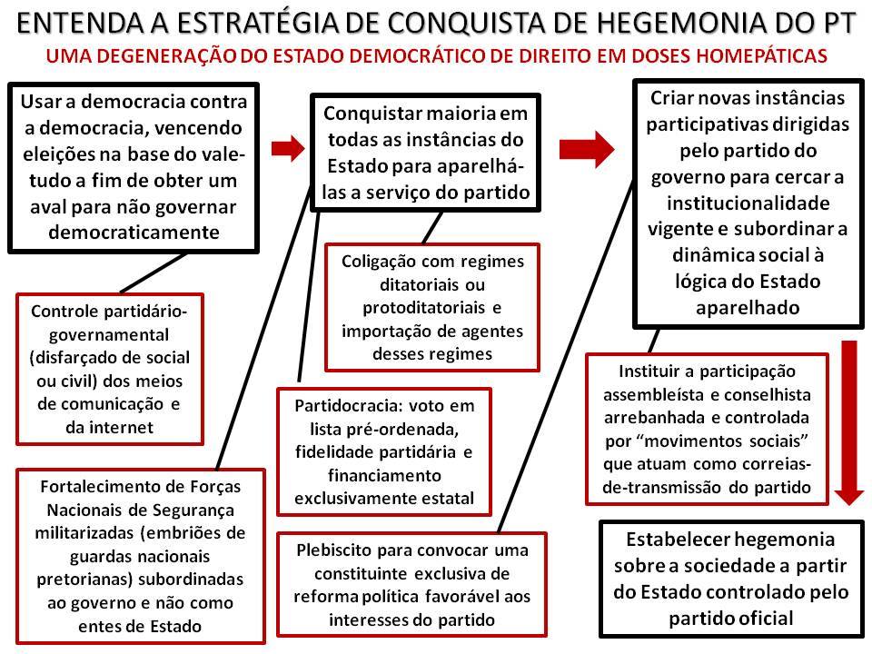 Temos claros sinais de que o PT tentava autocratizar a democracia brasileira. Há dois anos fiz um quadro demonstrativo dessas iniciativas autoritárias do PT: