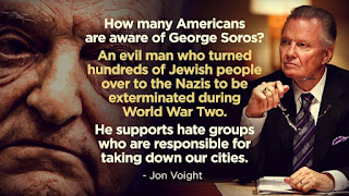 “Quantos americanos sabem quem é George Soros? Um homem pérfido que entregou centenas de judeus aos nazis para serem exterminados, na Segunda Guerra Mundial. Ele financia grupos que são responsáveis pela queda das nossas cidades”. Jon Voight, norte-americano e judeu.