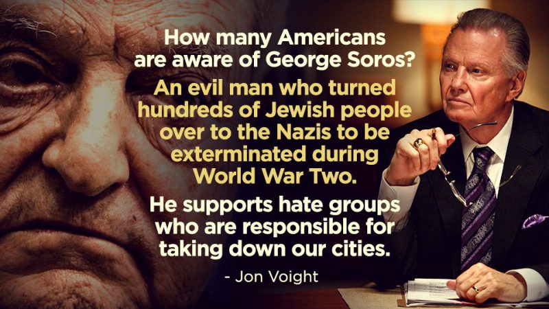 “Quantos americanos sabem quem é George Soros? Um homem pérfido que entregou centenas de judeus aos nazis para serem exterminados, na Segunda Guerra Mundial. Ele financia grupos que são responsáveis pela queda das nossas cidades”. Jon Voight, norte-americano e judeu.