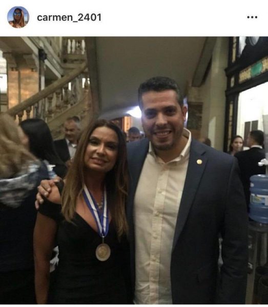 Em outra foto, aparece abraçada com o deputado estadual Rodrigo Amorim (PSL), um dos truculentos responsáveis por rasgar uma placa com o nome de Marielle Franco.