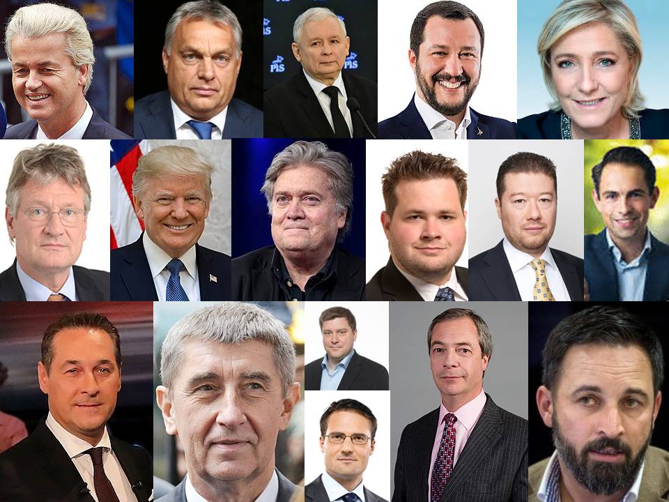 O problema é que o populismo de esquerda entrou em decadência para dar lugar ao populismo-autoritário de extrema-direita. A colagem abaixo mostra seus principais líderes (com exceção de Jair Bolsonaro, seu guru Olavo de Carvalho, seus filhos Flávio, Carlos e Eduardo e seus mais destacados sequazes, cuja lista já foi publicada aqui): Anders Vistisen, Andrej Babis, Donald Trump, Geert Wilders, Gyöngyösi Márton, Heinz-Christian Strache, Jaroslaw Kaczynski, Jörg Meuthen, Marine Le Pen, Matteo Salvini, Nigel Farage, Olli Kotro, Santiago Abascal, Steve Bannon, Tomio Okamura, Viktor Orbán, Vlaams Belang.