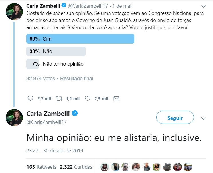 A agitação e propaganda pró-guerra continua. Depois do tweet do monarquista Orleans e Bragança (cujo print foi publicado acima) vejam o que está promovendo a deputada olavista-bolsonarista Carla Zambelli:
