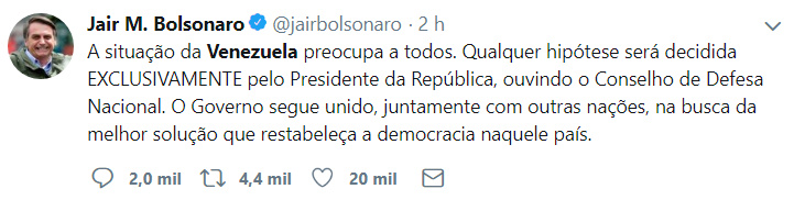 Sim, Bolsonaro negou ontem que o Brasil esteja pensando numa intervenção militar na Venezuela ou que haja a intenção de ceder o território brasileiro para a passagem de tropas americanas. Mas suas declarações foram oblíquas:
