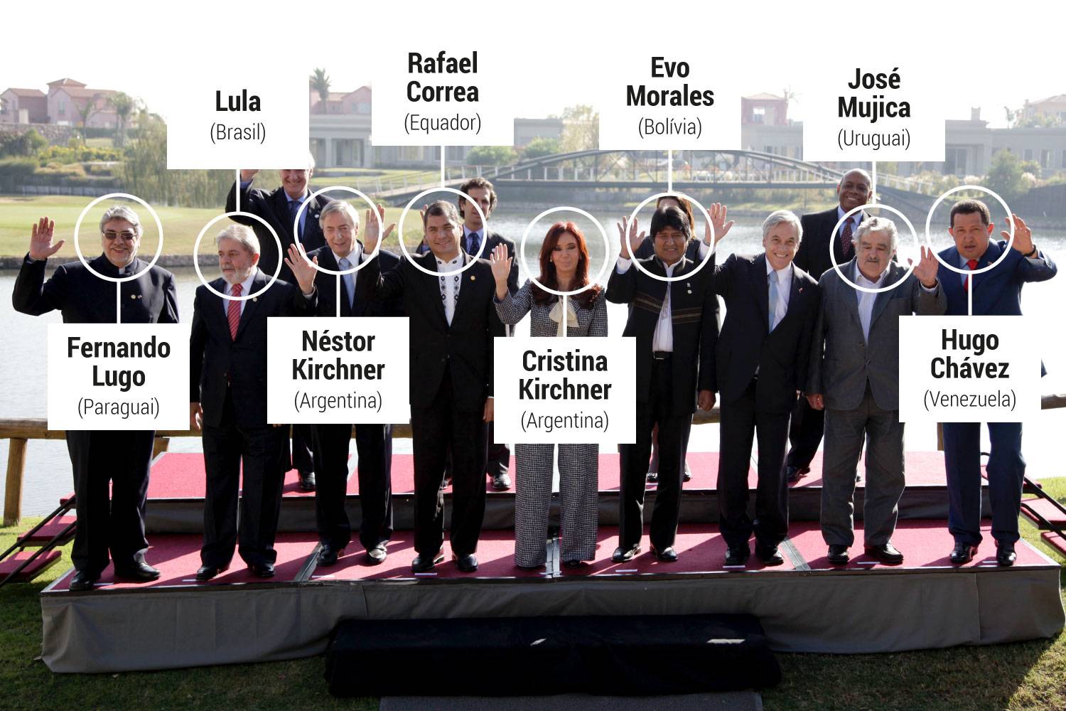 Uma boa imagem do neopopulismo, no seu auge, em 2010, na América Latina: Líderes em encontro da União das Nações Sul-Americanas (Unasul) em Los Cardales, na Argentina – 4/5/2010, na qual faltam alguns, como Daniel Ortega que é da América Central (Natacha Pisarenko/AP):