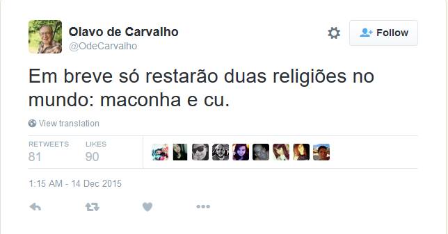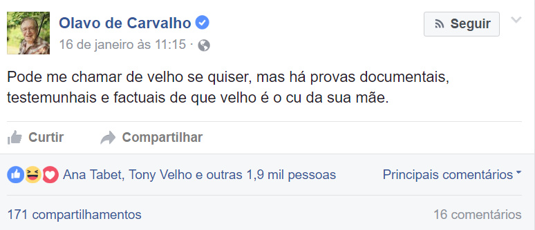 Em outro post (do dia 11 de novembro de 2016, às 14h50) ele – Olavo – escreveu: