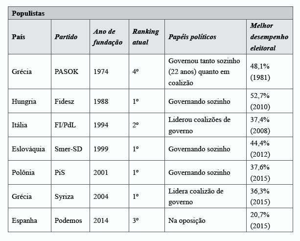 Olhando para a categoria de partidos populistas, o cenário novamente muda radicalmente. Com exceção do PASOK, todos esses partidos são bastante novos e posteriores à “terceira onda” de democratização. Enquanto grupo, eles se dividem igualmente entre agremiações populistas de direita (ANEL, Fidesz, Força Itália, PiS) e de esquerda (PASOK, Podemos, Smer-SD, Syriza). Também são encontrados exclusivamente na Europa Mediterrânea e Leste Europeu, tanto em países que nunca foram comunistas quanto em nações pós-comunistas. Para entender o crescimento do populismo nesses países, é preciso olhar para a fragilidade e inexperiência de suas instituições liberais-democráticas — uma condição que também favorece a ascensão de líderes carismáticos e personalistas (16).