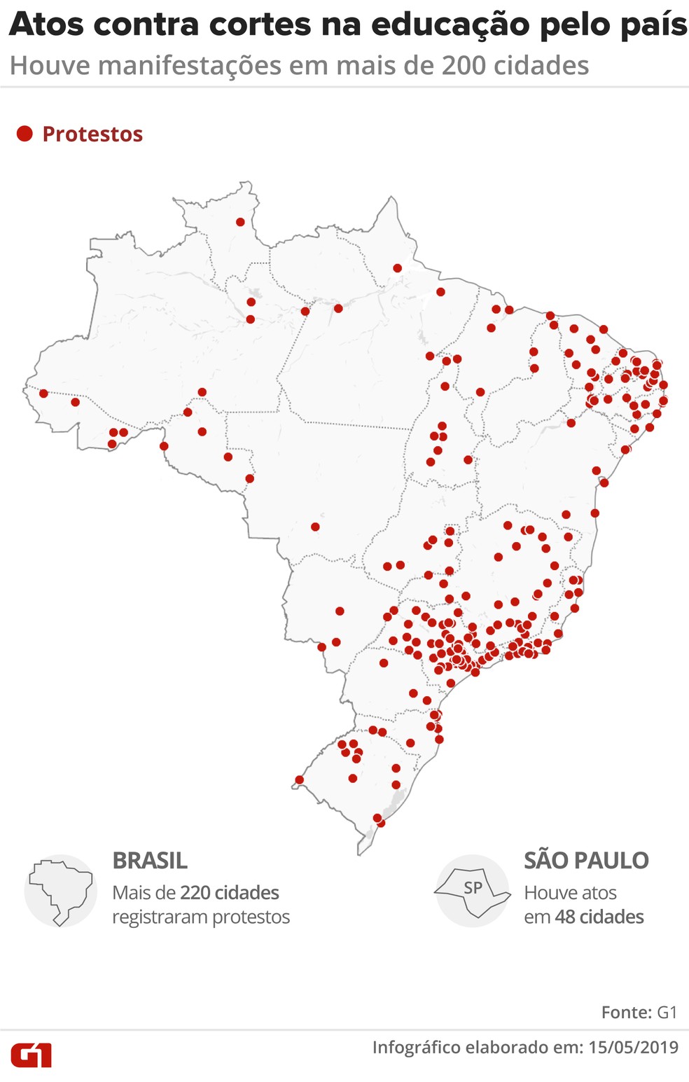 “Ao menos 222 cidades do Brasil, segundo levantamento do G1, tiveram manifestações, nesta quarta-feira (15), contra o bloqueio de recursos para a educação anunciado pelo Ministério da Educação (MEC). Houve atos em todos os estados do país e também no Distrito Federal.