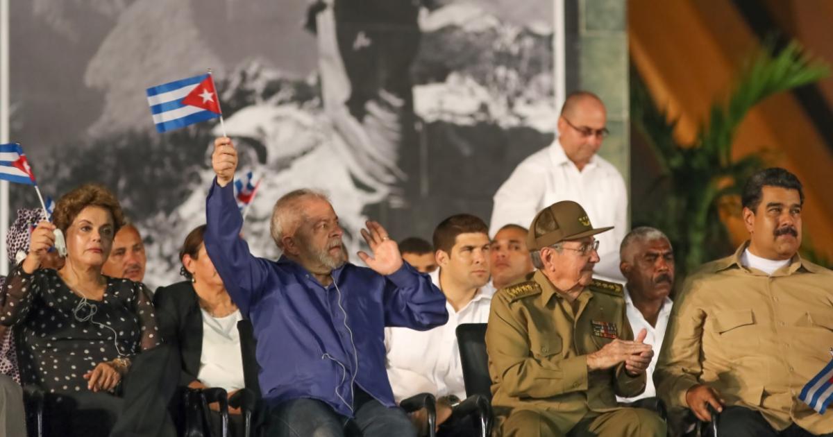 Mas o PT não fez nada disso e, ao que tudo indica, jamais o fará. Pelo contrário, Lula solto reafirmou o hegemonismo petista, declarou que o partido não deve fazer qualquer autocrítica (como se nada tivesse feito de errado, como se o mensalão e o petrolão não passassem de acusações falsas de seus inimigos) e ainda prometeu mais polarização. Em síntese, mostrando que não evoluiu um milímetro, Lula fez o PT voltar ao lugar do passado onde sua triste trajetória foi interrompida, para proclamar que continuará trilhando o caminho do neopopulismo (o populismo de esquerda que abraçou juntamente com seus parceiros bolivarianos, castristas, chavistas, lugoistas, evoistas, correistas, orteguistas ou sandinistas de segunda geração, funesistas et coetera). Basta olhar a foto que ilustra este post. Ou então a foto abaixo, onde aparecem Lula e Dilma, agitando bandeirinhas de Cuba, ao lado dos ditadores Raul Castro e Nicolás Maduro: