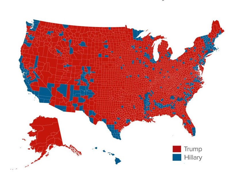 Por encima de las divisorias sociológicas habituales en el análisis político americano (sexo, raza, nivel de estudios) emerge una fractura entre el centro y la periferia del relato nacional muy similar a la del Brexit: las zonas rurales, los distritos obreros desindustrializados… todo lo que normalmente se interpreta en la lógica social desde los ejes políticos definidos en las grandes ciudades de servicios, ha dado la sorpresa. Sorpresa porque eran impredecibles bajo el marco de la «identity politics», de las estadísticas desde las que la universidad y la ciudad postindustrial se piensan a sí mismas. Ni siquiera hicieron falta grandes vuelcos, igual que en el mapa británico, ha bastado que se produzca una reducción de la ventaja esperada de Clinton en unos pocos lugares clave para que la noche electoral se tornara una pesadilla para la favorita.