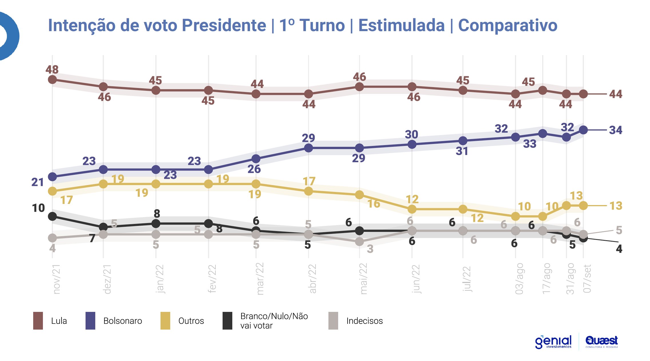 Segundo o Agregador de Pesquisas do Estadão (que é bem confiável), há 6 meses (em 10/03/2022) Lula tinha 44% e Bolsonaro 26%. Ontem (06/09/2022) Lula tinha os mesmos 44% e Bolsonaro 33%. Sim, todos os democratas sabemos que Bolsonaro deve sair do governo por qualquer meio (constitucional). Isso é um imperativo democrático. Mas é preciso analisar as pequisas sem paixões e preferências. Usá-las para fazer campanha eleitoral – mesmo que em prol do candidato menos ruim – não ajuda a democracia.