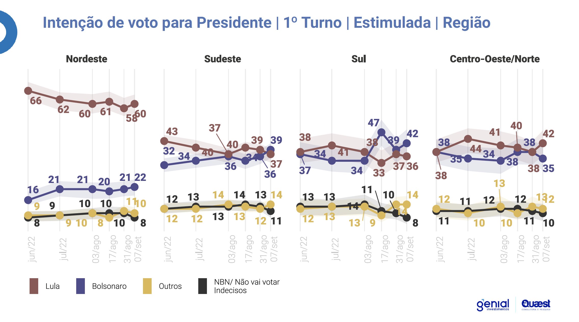 Por exemplo, é preciso pensar sobre os dados da pesquisa Genial-Quaest de hoje (07/09/2022) – um instituto também bastante confiável, que faz pesquisas presenciais e adota rigorosamente todos os critérios científicos conhecidos. Por que Bolsonaro – sendo um péssimo presidente, talvez o pior de nossa história – ultrapassa numericamente Lula no Sudeste e no Sul e empata tecnicamente com ele no Centro-Oeste?