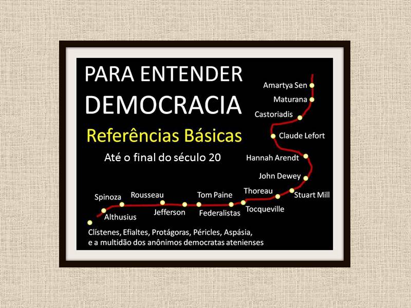 Ora, poder-se-ia argumentar: se não há propriamente uma tradição democrática significativa, por que então não construímos uma? Todas as tradições não se constroem, (é claro – e até por definição –) ex post, projetando linhas imaginárias de continuidade, da frente para trás? Todavia, seria possível construir uma tradição do pensamento democrático? A rigor, talvez não. Mas, se fosse possível, a linha imaginária de continuidade do pensamento democrático seria mais ou menos assim: